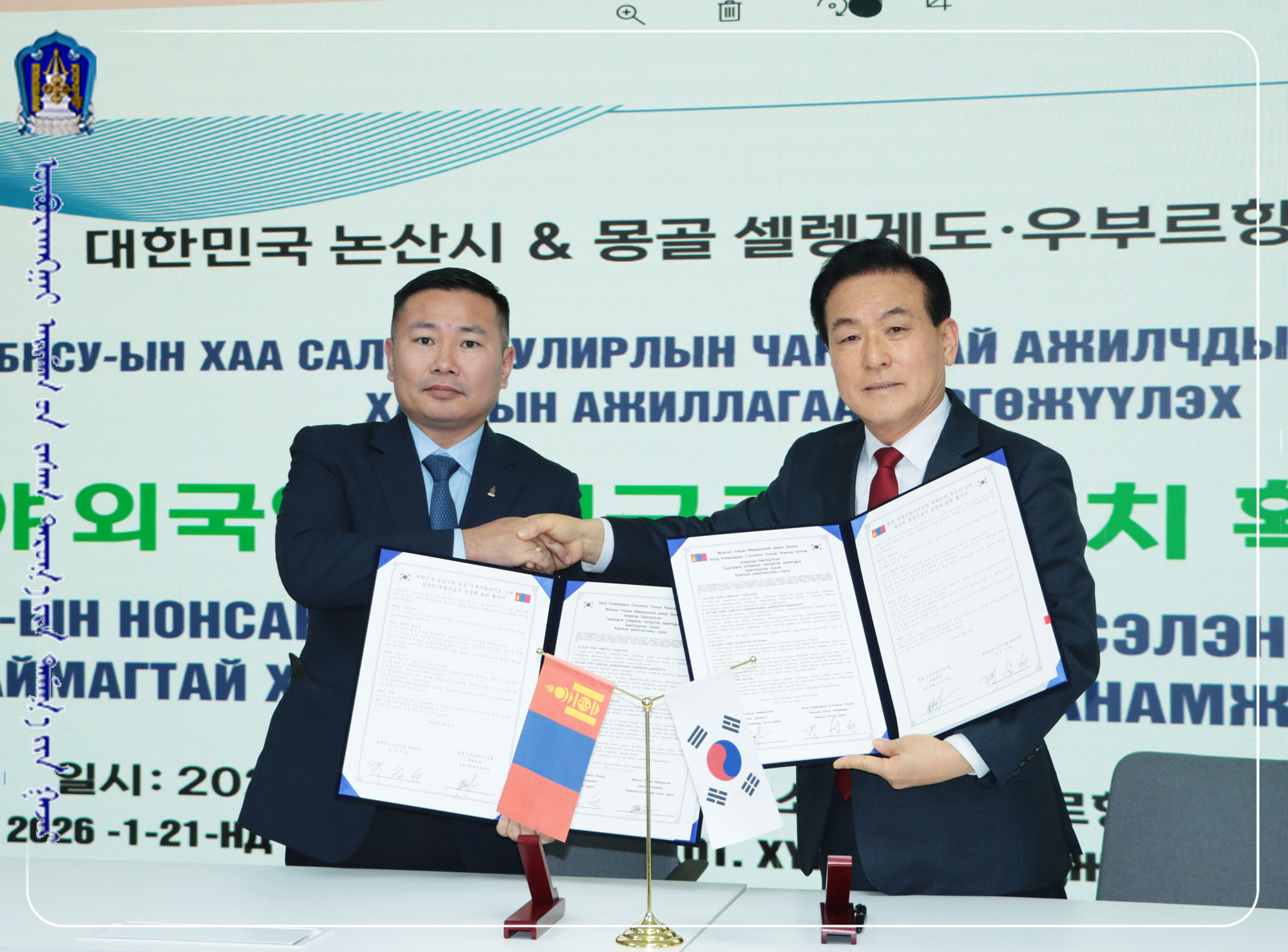 "Монгол улсын Хүнс, хөдөө аж ахуй, хөнгөн үйлдвэрийн яам болон Бүгд Найрамдах Солонгос улсын Чунчоннам-до мужийн Нонсан хот хооронд хүнс, хөдөө аж ахуй, хөнгөн үйлдвэрийн салбарт хамтран ажиллах тухай" хамтын ажиллагааны гэрээ байгуулах ёслол өчигдөр /2026.01.21/ ХХААХҮЯ-ны хурлын танхимд болов.