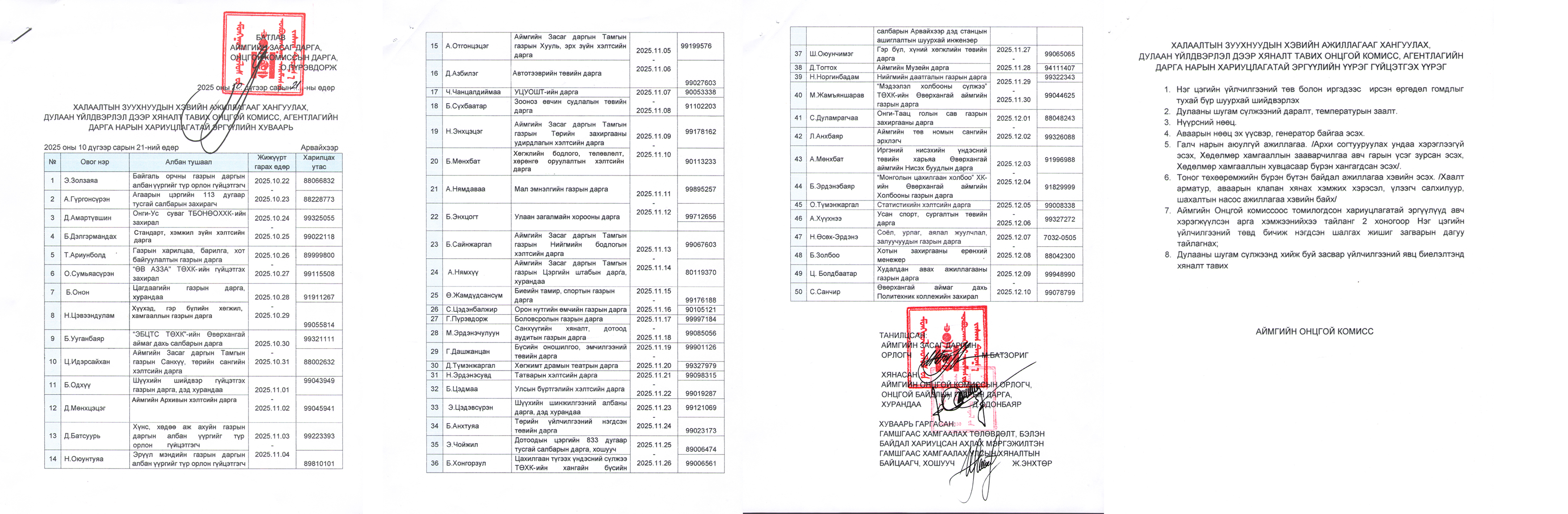 Аймгийн Онцгой комиссоос 2025 оны 10 дугаар сарын 22-ны өдрөөс энэ оны 12 дугаар сарын 11-ний өдрийг хүртэлх хугацаанд ажиллах “Халаалтын зуухнуудын хэвийн ажиллагааг хангуулах, дулаан үйлдвэрлэл дээр хяналт тавих онцгой комисс, агентлагийн дарга нарын хариуцлагатай эргүүлийн хуваарь”-ийг гаргалаа.